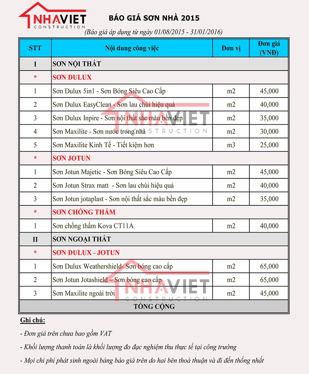 (Đây là bảng giá 1 số loại sơn thông dụng và cao cấp, còn nhiều loại sơn khác với giá rẻ hơn)